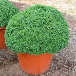 Fesleğen olarak da anılan tek yıllık ve genellikle ılıman bölgelerde yetişen aromatik bir bitkidir. Boyları genellikle 25 ile 30 cm arasında, yeşil yaprakları yumuşak ve küçük olup şekil olarak ise top görünümlüdür. İsmini de buradan alır. Sezon sonuna doğru minik beyaz çiçekler açar. Yaprakları yenilebilir. Soğuğa karşı çok duyarlı olan fesleğen bitkisi, sıcak ve kuru ortamları sever. Okşanmayı seven ve okşandıkça koku saçan fesleğenin yaydığı güzel kokunun yanında sinek kovucu özelliği de vardır. Saksı yetiştiriciliğine uygundur.